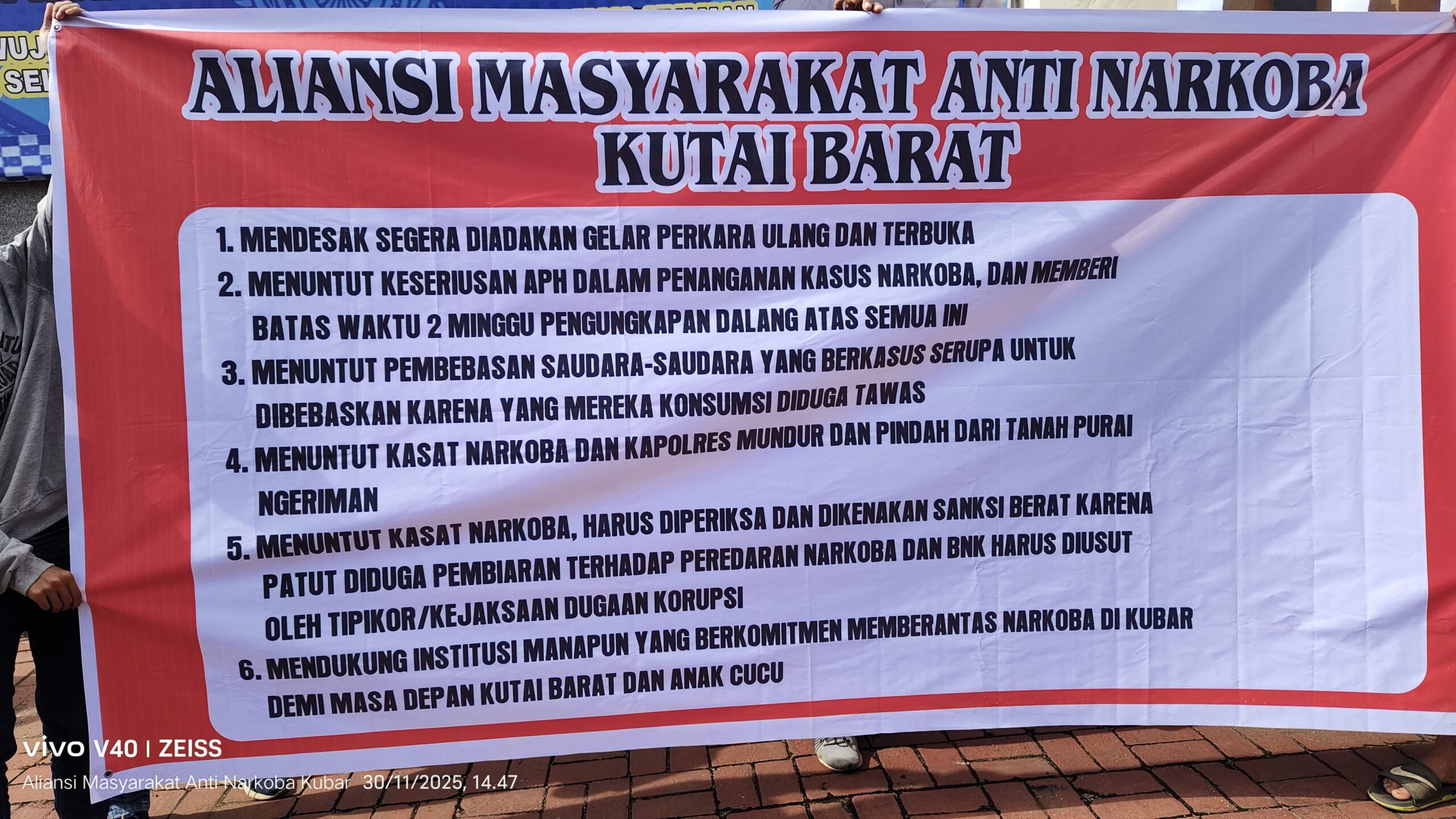 Ratusan warga yang tergabung dalam Aliansi Masyarakat Anti Narkoba Kutai Barat menggeruduk Mapolres Kutai Barat, Minggu (30/11/2025), menuntut keadilan dan reformasi total di tubuh penegak hukum.
