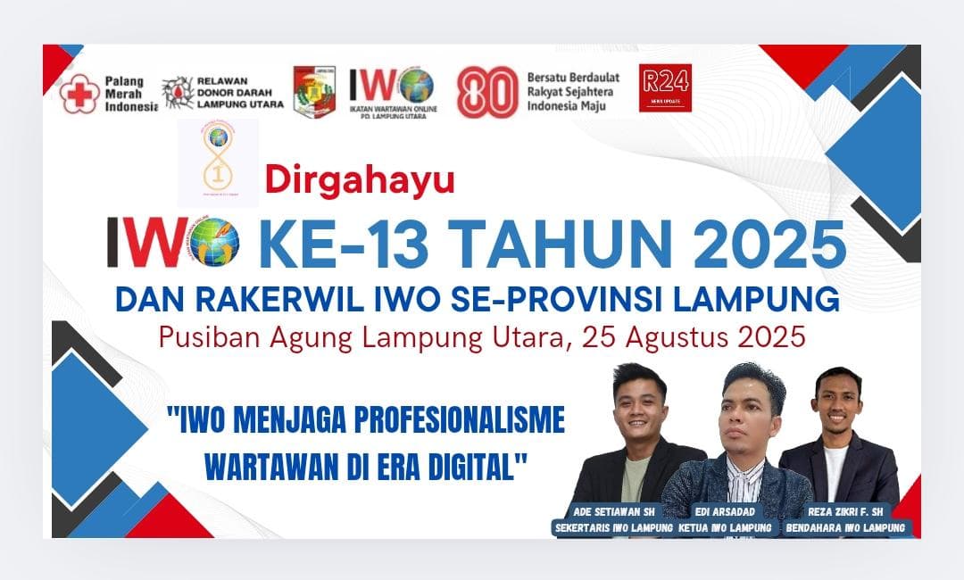 Reportase Expose.com, Lampung Utara – Rapat Kerja Wilayah (RAKERWIL) Ikatan Wartawan Online (IWO) se-Provinsi Lampung tahun 2025 akan diselenggarakan pada Senin, 25 Agustus 2025, di Pusiban Agung, Jalan Estiko Siomi, Kelurahan Kelapa 7, Kotabumi Selatan, Lampung Utara.