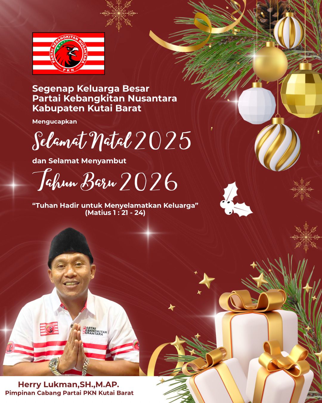 Reportase Expose.com, Sendawar – Ketua Partai Kebangkitan Nusantara (PKN) Kabupaten Kutai Barat (Kubar) melalui ketuanya, Herry Lukman, SH., M.AP, menyampaikan ucapan selamat Hari Raya Natal 2025 dan Tahun Baru 2026 kepada seluruh umat Kristiani dan masyarakat yang merayakan. Ia berharap momentum Natal dan pergantian tahun ini dapat menjadi ruang refleksi bersama untuk menumbuhkan harapan baru, memperkuat persaudaraan, serta meneguhkan langkah penuh optimisme menuju masa depan yang lebih baik.