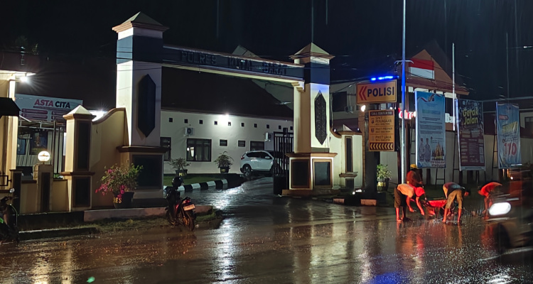 Namun, dengan sigap pihak Polres menurunkan puluhan pekerja untuk membersihkan jalan yang berlumpur meski pada saat hujan turun.